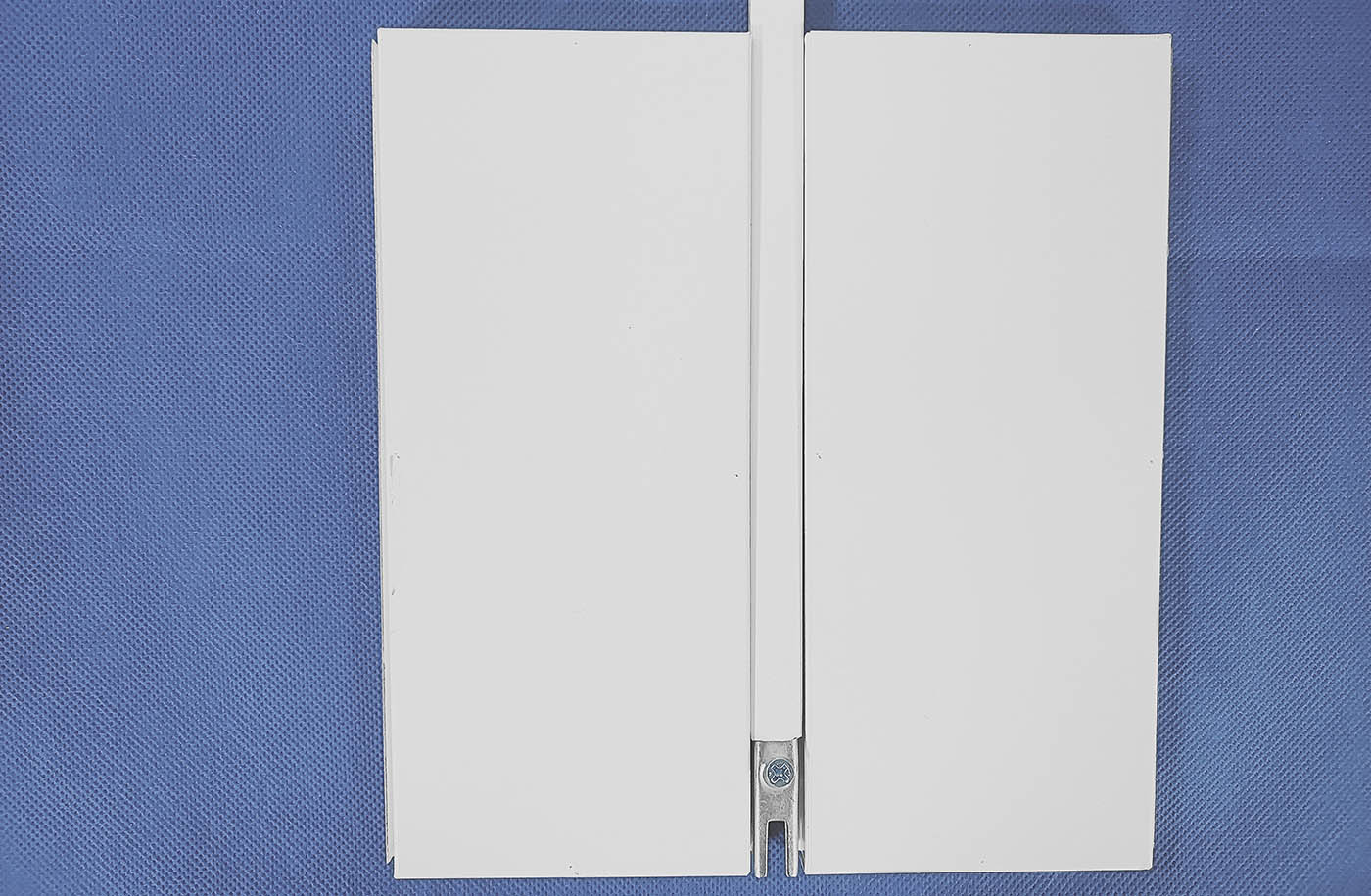 4、墙板连接:墙板两边折有V形边或者U型边,采用钢制镀锌M压条配M4*18自攻螺钉固定。